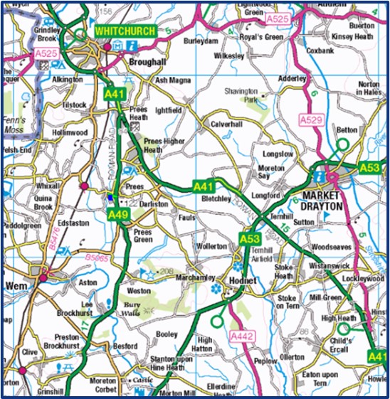 - From Market Drayton – at Tern Hill follow A41 north at Prees Heath and follow A49 south, then follow directions ‘From Whitchurch’.